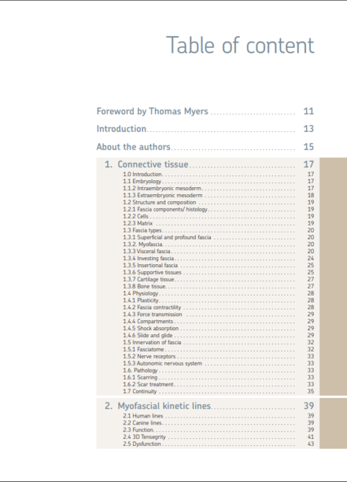 Dette 377 sider fascia atlas gennemgår historiske anatomiske aspekter, den nyeste viden om fascia både generelt, mikroskopisk som makroskopisk, samt en detaljeret anatomisk gennemgang af hestens og hundens fascia stukturer fra det mest overordnede niveau til de mindste detaljer på hoved, hals og krop samt på for- og bagben.